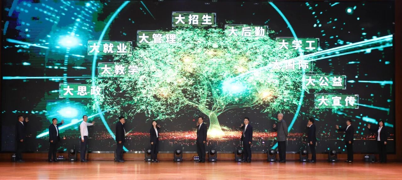 在全场期待中,“十大系统工程”启动仪式拉开帷幕。激昂乐声中,“十大系统工程”领导小组组长、执行组长、副组长及各工程总指挥代表共同登台。随着象征希望的能量树被点亮,“大管理、大教学、大思政、大宣传、大学工、大后勤、大招生、大就业、大国际、大公益”十大系统工程全面启动,现场掌声雷动,气氛达至高潮。